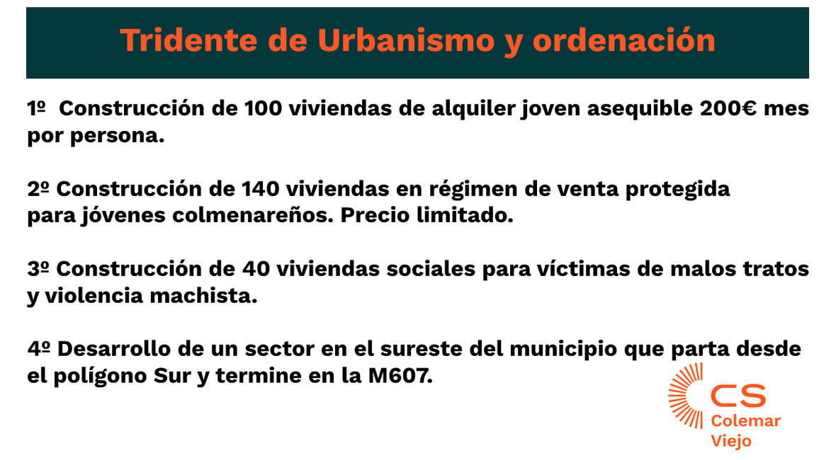 En Colmenar Viejo, la vivienda ya es un lujo que muchos jóvenes colmenareños no se pueden permitir. Vivir en el municipio que les vio crecer y donde vive su familia es para unos pocos privilegiados. Además, el actual gobierno municipal y su concejal de urbanismo, solo quieren hacer casas caras y atraer a cierto sector económico hacia el municipio. Pero esto provoca que los precios de todo Colmenar se disparen. El nuevo plan de urbanismo estará enfocado en revertir esta incómoda situación. Muchos jóvenes no quieren tener que abandonar Colmenar Viejo, y muchos padres no quieren que sus hijos tengan que irse.